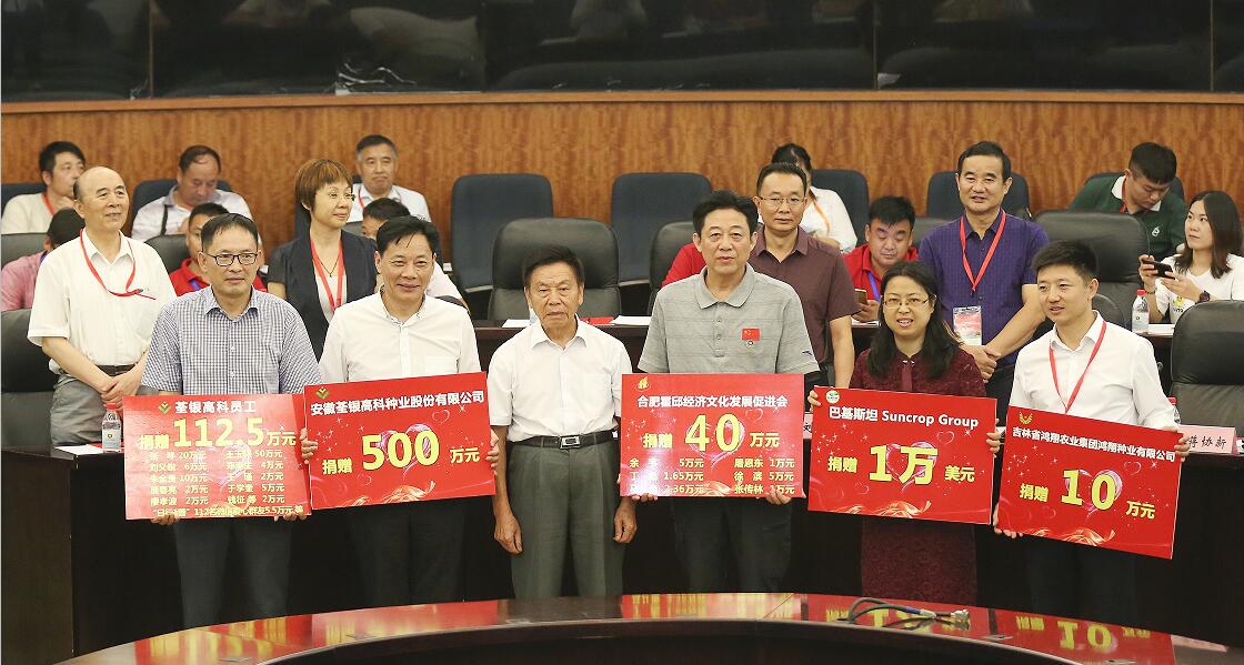 善人者,人亦敬之。張海銀種業(yè)基金會(huì)五年來(lái)的公益慈善活動(dòng)得到社會(huì)各界愛心人士和愛心單位600余次的的慷慨捐贈(zèng),累計(jì)950多萬(wàn)元。會(huì)上還進(jìn)行了基金會(huì)2018年公益愛心捐贈(zèng)儀式。荃銀高科母子公司高管和員工多次參與基金會(huì)濟(jì)困助學(xué)公益慈善活動(dòng),本次捐贈(zèng)112.5萬(wàn)元;吉林鴻翔種業(yè)集團(tuán)鴻翔種業(yè)有限公司捐贈(zèng)10萬(wàn)元;巴基斯坦Suncrop Group(陽(yáng)光作物集團(tuán))捐贈(zèng)1萬(wàn)美元;合肥霍邱經(jīng)濟(jì)文化發(fā)展促進(jìn)會(huì)及會(huì)員為基金會(huì)貧困助學(xué)項(xiàng)目捐贈(zèng)40萬(wàn)元;安徽荃銀高科種業(yè)股份有限公司捐贈(zèng)500萬(wàn)元。基金會(huì)將按捐贈(zèng)人捐贈(zèng)的意愿和在業(yè)務(wù)范圍內(nèi)開展公益項(xiàng)目和慈善活動(dòng)。
